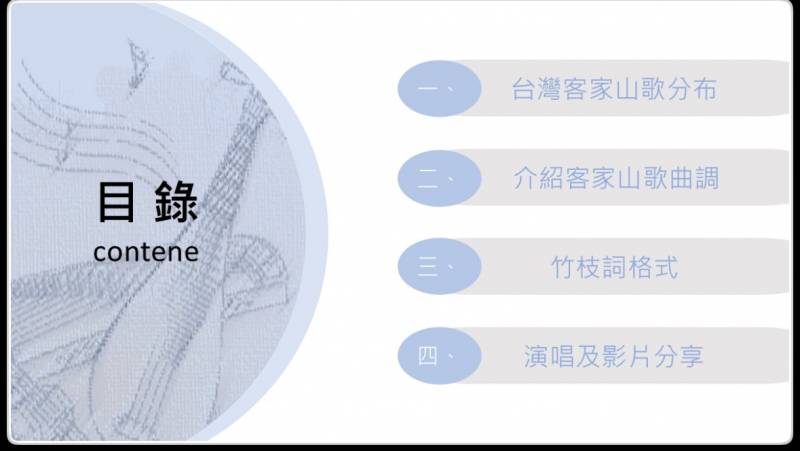 | 客家傳統山歌-山歌子(一) | 山歌子示範教學及如何達到"字正腔圓",並了解山歌子唱法 |